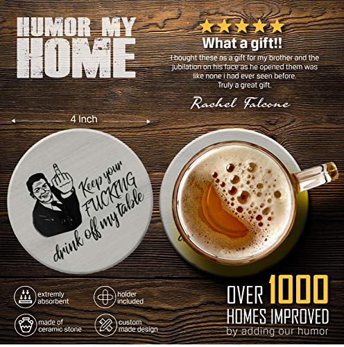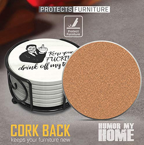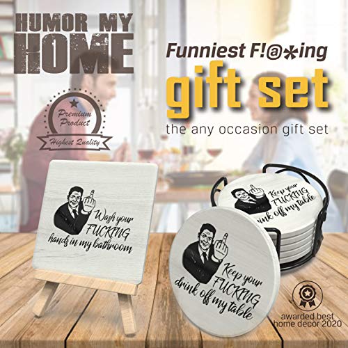 Funny Table Coasters for Drinks Absorbent and Bathroom Vanity Sign Set, 9 Piece w/ Metal Holder, Home Decor, Birthday, Secret Santa, White Elephant Decor, Home Office and Bathroom Decor, Unique
